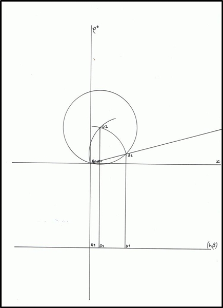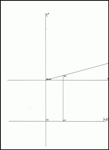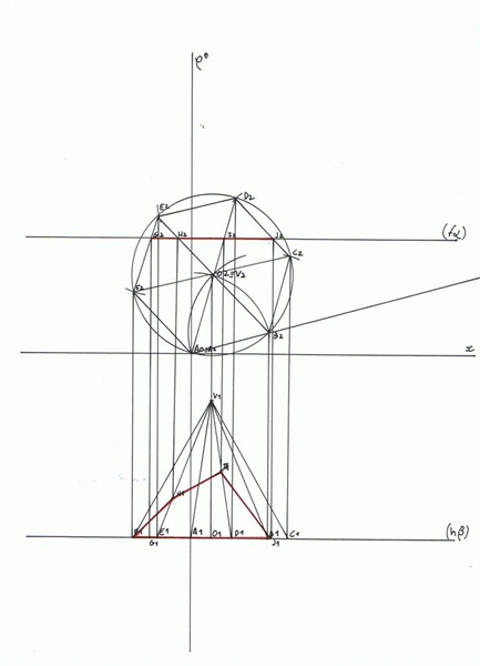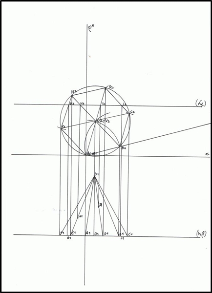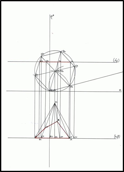 Marca-se a linha auxiliar que faz 15º com o eixo de x, para se determinar o B2, que se encontra a 3,5 cm de A2. Encontra-se também o B1, que tal como A, pertence a base da pirâmide.