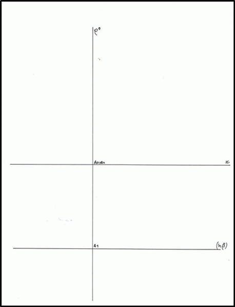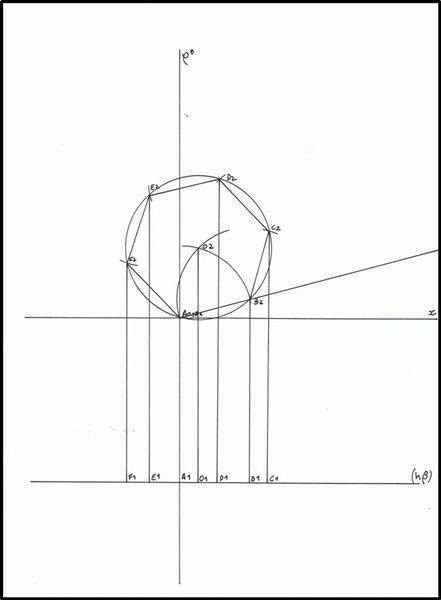 Enunciado Determine as projecções da figura da secção produzida por um plano horizontal α numa pirâmide hexagonal regular, situada no 1º diedro, com a base [ABCDEF], contida num plano frontal (de frente), sabendo que: . O vértice A tem abcissa nula, 8 cm de afastamento e pertence ao PHP; . A aresta [AB] da base mede 3,5 cm e faz um ângulo de 15º, abertura para a direita, com o PHP. . O vértice V da pirâmide tem 2 cm de afastamento; . O plano α tem 5 cm de cota. Começa-se por marcar o ponto A, com 8 cm de afastamento e cota e abcissa nula. Marca-se também o plano β, onde a base da pirâmide pertence.