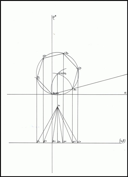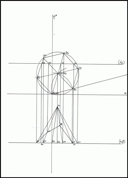 Marca-se o ponto V1, que sabemos ter 2 cm de afastamento. O ponto V2 é coincidente com O 2, pois a pirâmide é regular. De seguida, une-se os pontos A1, B1, C1, D1, E1 e F1 ao ponto V1 e obtém-se a projecção da pirâmide.