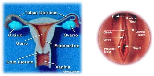 A vagina é revestida por uma membrana mucosa, cujas células liberam glicogénio. Bactérias presentes na mucosa vaginal (Lactobacilos) fermentam o glicogénio, produzindo ácido láctico que confere ao meio vaginal um pH ácido, que impede a proliferação da maioria dos microrganismos patogénicos. Durante a excitação sexual, a parede da vagina se dilata e se recobre de substâncias lubrificantes produzidas pelas glândulas de Bartholin facilitando a penetração do pénis. Durante a fase proliferaria do ciclo menstrual, o muco é fluido e depois da ovulação ele se torna viscoso, formando um tampão que se converte numa barreira protectora. As características de fluidez ou viscosidade do muco cervical dependem respectivamente da acção hormonal do estrogénio e da progesterona. Vulva A genitália externa ou vulva é delimitada e protegida por duas pregas cutâneo-mucosas intensamente irrigadas e enervadas - os grandes lábios. Na mulher em idade pós-puberdade, os grandes lábios são cobertos por pêlos pubianos. Mais internamente, outra prega cutâneo-mucosa envolve a abertura da vagina - os pequenos lábios - que protegem a abertura da uretra e da vagina. Na vulva também está o clítoris, formado por tecido esponjoso eréctil, homólogo ao pénis do homem. Trompas de Falópio Tubas uterinas, ovidutos ou trompas de Falópio: são dois ductos que unem o ovário ao útero. Seu epitélio de revestimento é formado por células ciliadas. Os batimentos dos cílios microscópicos e os movimentos peristálticos das tubas uterinas impelem a gameta feminina até o útero. Ovários São dois, um de cada lado do útero. Os ovários são as gônadas femininas. Produzem estrogénio,progesterona e hormônios sexuais femininos. Têm forma oval e também produzem os ovócitos.