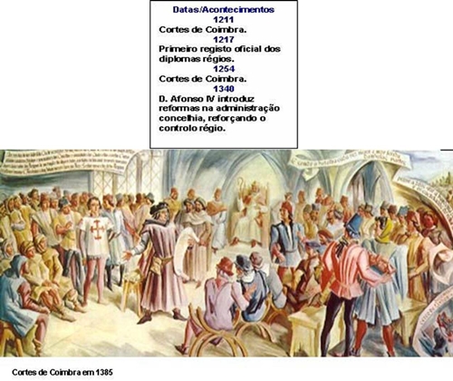 As Cortes eram assembleias que o rei convocava para ouvir o parecer dos membros do clero e da nobreza – a partir de 1254 (Cortes de Leiria), passaram a participar também os procuradores dos concelhos – em matérias importantes para a governação, como o lançamento de impostos, a modificação do valor da moeda e a promulgação de leis.