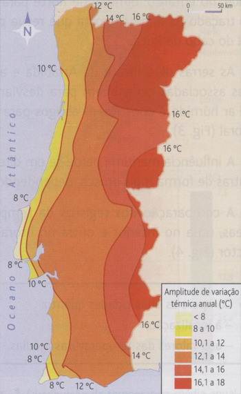 DIFERENÇAS ENTRE JANEIRO E JULHO . Quantidade de isotérmicas; . Disposição das isotérmicas; . As isotérmicas de Janeiro estão mais espaçadas, enquanto as de Julho estão mais juntas. HUMIDADE NA ATMOSFERA A humidade na atmosfera é medida em gramas por m³ de ar. A humidade absoluta é a quantidade de vapor de água contida num determinado volume de ar, num determinado momento e a uma determinada temperatura. A capacidade do ar para reter vapor de água tem um limite que aumenta com a temperatura. Quando a humidade absoluta atinge esse limite, significa que o ar ficou saturado, isto é, atingiu o seu ponto de saturação – quantidade máxima de vapor de água que um determinado volume de ar pode conter a uma determinada temperatura. Quanto mais baixa for a temperatura, maior a probabilidade de ocorrer precipitação. A humidade relativa é a relação entre a humidade absoluta e o ponto de saturação a uma dada temperatura; varia entre 0% e 100% no sentido inverso ao da temperatura. Quando a humidade relativa é de 100%, significa que o ar está saturado. Não esquecer que para haver precipitação, tem de haver, necessariamente, duas situações: . humidade (ou vapor de água); . subida do ar OS TIPOS DE CLIMA EM PORTUGAL Clima temperado mediterrânico de influência atlântica – no Norte Litoral (Porto e Aveiro, por exemplo) . Temperaturas médias amenas ao longo do ano; . Amplitude de variação térmica anual moderada ou fraca; . Precipitação abundante, sobretudo no Outono e Inverno; . Dois meses secos. Clima temperado mediterrânico de influência continental – no Norte Interior (Vila Real e Castelo Branco, por exemplo) . Temperaturas relativamente baixas no Inverno e elevadas no Verão; . Amplitude de variação térmica anual acentuada; . Precipitação fraca; . Três a quatro meses secos. Clima temperado mediterrânico – em todo o Sul do País (Évora, por exemplo) . Temperaturas médias suaves no Inverno e elevadas no Verão; . Amplitude de variação térmica anual moderada; . Precipitação fraca; . Quatro a seis meses secos. REGIÕES AUTÓNOMAS Arquipélago dos Açores (clima temperado marítimo) . Temperaturas médias amenas ao longo de todo o ano, com uma amplitude da variação térmica anual moderada ou fraca; . Precipitação abundante, sobretudo no Outono e no Inverno; . Estação seca nunca superior a dois meses e só nas ilhas mais orientais. Arquipélago da Madeira (clima predominantemente mediterrânico) Na Ilha da Madeira, devido à orientação E-O do relevo: . na vertente norte, os ventos húmidos do Atlântico tornam a precipitação mais elevada; . a vertente sul, mais abrigada e exposta a ventos provenientes do Norte de África, é mais quente e seca. A Ilha de Porto Santo, de relevo quase plano, apresenta temperaturas mais elevadas, precipitações fracas e uma estação seca mais prolongada.