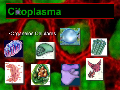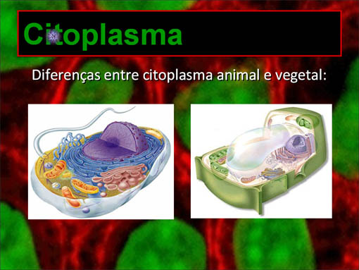 Citoplasma O citoplasma é o espaço (intra-celular) compreendido entre a membrana plasmática e o envoltório nuclear (núcleo) nos seres eucariontes, enquanto que nos procariontes o citoplasma é toda a área celular. O citoplasma desempenha um papel estrutural, mantendo a consistência e a forma da célula. É também o local onde são armazenadas as substâncias químicas indispensáveis à vida. Aqui, ocorrem as reacções metabólicas vitais (glicólise anaeróbia e síntese proteica). O citoplasma é constituído por uma massa semi-fluida e coloidal, o hialoplasma. Este é, um componente aquoso (cerca de 80%) composto por iões e macro moléculas como enzimas, hidratos de carbono, sais, proteínas, e uma grande proporção de RNA (ácido ribonucleico). O hialoplasma pode variar na sua consistência gelificada, o que depende das condições do meio e da fase de actividade em que a célula se encontra. Quanto mais viscoso é chamado ectoplasma ou citogel, e quanto mais aquoso é denominado endoplasma ou citosol composto por líquido em movimento. As regiões exteriores da célula são mais viscosas que o interior. O citoplasma também contém uma componente não solúvel, na qual se encontram dispersos os organelos celulares, que são: mitocôndrias, lisossomas, ribossomas, peroxissomas, vácuolos, citoesquelo, retículo endoplasmático e o aparelho de golgi (estruturas membranares), bem como cloroplastos (células vegetais) e centríolos (células animais). Apesar de todas as células possuírem citoplasma, as suas características são diferentes das células animais para as vegetais. Nas células animais, o citoplasma ocupa cerca de metade do volume da célula, enquanto que nas células vegetais, este ocupa menos espaço devido a existência de vacúolos de maiores dimensões.