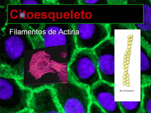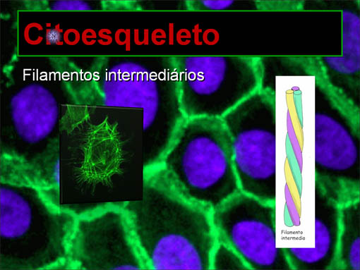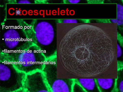 Citoesqueleto Formado por proteínas filamentosas/tubulares que são responsáveis por manter a forma da célula e auxiliam os movimentos celulares. Microtúbulos São os filamentos formados por tubulinas – proteínas que são constituídas por duas subunidades α (alfa) e β (beta). Quando varias tubulinas se ligam – a ponte de uma alfa com uma beta formam filamentos e, treze desses filamentos formam microtubulos – que são as proteínas filamentosas mais grossas e espessas. Filamentos de Actina Possuem dois profilamentos que são constituídos por actina (proteína). Quando estes dois profilamentos se entrelaçam formam um filamento – foram proteínas filamentosas finas. Filamentos intermediários Têm uma espessura entre os microtubulos e os filamentos de actina – dai o seu nome. Não alteram a sua forma ou tamanho, ao contrário dos filamentos de actina e dos microtubulos que, quando necessário aumentam e diminuem o seu tamanho.