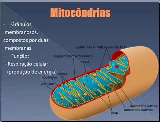 Mitocôndrias: • Grânulos membranosos, compostos por duas membranas • Função: - Respiração celular (produção de energia)