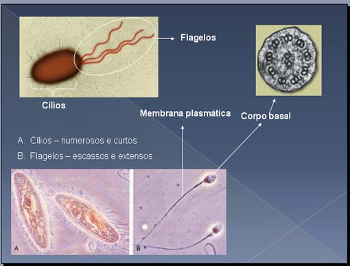Cílios • Estruturas móveis, constantes numa única direcção, numerosas e curtas • Contêm microtúbulos (estrutura 9+2) • Função: - Movimentação de fluidos sobre a superfície celular