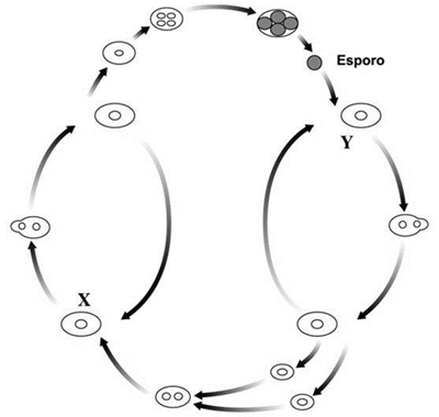 4.1. Classifique como verdadeira (V) ou falsa (F) cada uma das seguintes afirmações, relativas à interpretação do ciclo de vida esquematizado na figura 1. A – Os esporos dão origem a leveduras haplóides. B – A levedura assinalada com a letra X é diplonte. C – A levedura assinalada com a letra Y pode dividir-se por mitose. D – Os esporos representados resultaram de mitoses sucessivas. E – A célula assinalada com a letra Y pode reproduzir-se por gemulação. F – Os esporos de Saccharomyces cerevisæ são diplóides. G – A gemulação da levedura X é responsável pela alternância de fases nucleares. H – As leveduras X e Y apresentam a mesma informação genética. Outros Trabalhos Relacionados