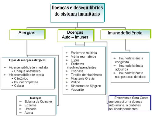 dirige a produção da célula hospedeira que caus A diminuição progressiva do número de linfócitos T deixa o organismo muito susceptível a doenças “oportunistas” e a cancros. Um indivíduo infectado pelo VIH reage à sua presença produzindo anticorpos – é seropositivo. Os vírus que se encontram no interior de células infectadas escapam à acção dos anticorpos. Um indivíduo seropositivo, mesmo sem sintomas clínicos, pode transmitir o VIH. Não há cura nem vacina para a doença, mas a sua progressão pode ser retardada por drogas inibidoras da transcriptase reversa, entre outras. Imunodeficiência nas pessoas de idade Em consequência da idade, ocorre também um certo grau de imunodeficiência. Por exemplo, o timo, que desempenha um papel importante na produção dos linfócitos T, atinge o seu maior volume na puberdade. Seguidamente, vai diminuindo de tamanho, provocando um declínio no número e actividade dos linfócitos T. Há também um declínio do número dos linfócitos B. Anexo Sara C: “Como descobri muito nova, sempre me habituei a viver com a doença...” Entrevista a Sara C, que possui uma doença auto-imune, Diabetes Insulinodependente.