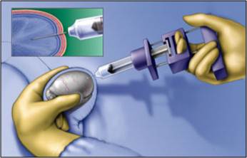Fig.12 – Imagem desenhada de uma punção do testículo. No caso de haver ausência de espermatozóides no sémen, é necessário que os espermatozóides sejam captados através de uma punção dos testículos. Em casos mais severos, ou seja, em casos em que existem muitas tentativas falhadas de obter gâmetas em boas condições, é necessário que seja realizada uma extracção de amostras do testículo por biopsia. Nas situações em que as amostras de sémen revelem um número ou qualidade de espermatozóides anormal, é necessário realizarem-se exames complementares no homem para verificar se existem anormalidades cromossómicas que possam levar ao aparecimento de doenças geneticamente transmitidas. Situação em que é utilizado Este método pode ser utilizado no caso de o sémen do indivíduo do sexo masculino ser de baixa qualidade, ou até se no mesmo houver ausência de espermatozóides. Este método é, assim, utilizado em alternativa à fertilização in vitro, quando alguns factores masculinos como as alterações do número, morfologia ou mobilidade dos espermatozóides são causas de infertilidade. É ainda possível utilizar este processo caso o membro masculino do casal seja portador do vírus HIV ou do vírus da hepatite B ou C, através da criopreservação dos espermatozóides em azoto líquido após estes serem “lavados” e preparados. Apenas se procede à microinjecção citoplasmática do espermatozóide após a confirmação da não-detecção do vírus por estudos de biologia molecular.
