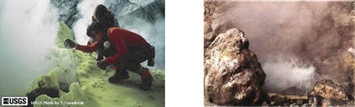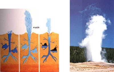 Grav.33 . Os géiseres São jactos intermitentes e periódicos de água e vapor de água, a elevadas temperaturas típicos de algumas regiões vulcânicas. A água expelida tem origem nas camadas freáticas, que se localizam próximo da câmara magmática. Depois de aquecidas, forma-se vapor de água, que ascende à superfície através das fissuras.