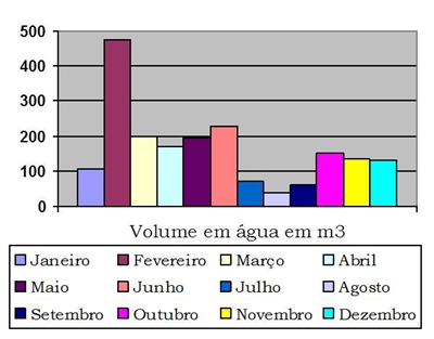 No ano de 2006, como evidencia o gráfico, o mês em que se consumiu mais água foi em Fevereiro. Esse valor muito acima da média não se deve ao facto de se ter consumido assim tanta água. Deve-se à acumulação de água resultante dos meses de Verão, pois os números do consumo de água nessa estação não são mais que uma mera estimativa. Segundo o Conselho Executivo, esse valor acima da média (a média é cerca de 163,08 m3) vem sempre registada ou nos primeiros meses do ano ou em Dezembro. Alguns dos valores mais elevados devem-se a fugas de água. Uma delas foi causada por um aluno e outra por uma ruptura que deixou água a correr durante um fim-de-semana. De seguida apresentamos o consumo de água na nossa escola visto noutra perspectiva, desta vez em euros, com uma média de 91,65 euros por mês: