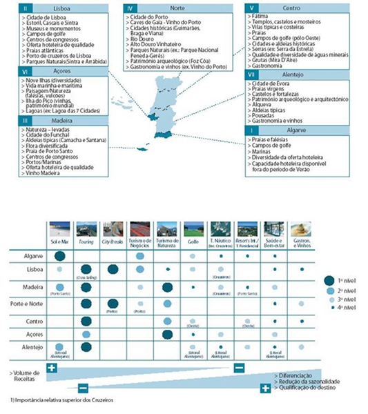 Pode se no entanto ver que, dos países que os indivíduos inquiridos visitaram, Portugal lidera a lista na intenção de possivelmente se reformarem em território português. Factores determinantes na evolução registada no turismo Há dois tipos de elementos para classificar a qualidade do que o nosso país pode oferecer a quem vem de fora, estes podem ser diferenciadores ou qualificadores. Os elementos diferenciadores que destacam o nosso País dos destinos concorrentes são: O clima e a luz. Portugal é um país do sul da Europa com temperaturas amenas a maior parte do ano, com pouca precipitação fora do Inverno e que tem o maior número de horas de sol de toda a Europa. História e Cultura. Portugal é marcado pela preservação da sua cultura como se pode comprovar através do fado, trajes populares (como por exemplo o caso das nazarenas), festas populares, romarias etc. Hospitalidade. Muitas vezes conquistados pelo estômago, os turistas estrangeiros encontram em Portugal uma grande diversidade de gastronomia e vinhos. Exemplo disso são os conhecidíssimos pasteis de Belém e famoso vinho do Porto. A qualidade dos serviços e a receptividade dos portugueses aos estrangeiros são factores também muito importantes para uma recepção hospitaleira aos turistas estrangeiros. Diversidade concentrada. Portugal foi muito influenciado culturalmente por povos como os celtas, os romanos e os mouros. Essas influencias hoje são visíveis como por exemplo em aquedutos, e outras obras arquitectónicas. Temos também uma grande variedade de Subculturas regionais (Lisboa, Algarve, Minho, Douro) Esta diversidade está visível por exemplo no tipo de paisagens, onde no Alentejo se encontra os típicos montados, tradicionalmente caracterizados pela sua paisagem plena, e depois mais a norte se pode encontrar o Douro, um paisagem com relevo caracterizada pelos socalcos. Também a diversificada oferta de realidades e ofertas é muito importante para este elemento. Exemplo: Praias, Casinos, Golfe, Ruralidade, florestas etc. Em relação aos elementos qualificadores que destacam Portugal, eles são: Modernidade. Portugal é um país europeu moderno e que apresenta sofisticação nos seus serviços. Segurança. Portugal é considerado um país com taxas de criminalidade reduzidas. Qualidade acessível. Serviços com bastante qualidade mas com preços competitivos. Os mais diversificados factores atractivos do turismo português estão Geograficamente separados, tendo cada região as suas atracções.