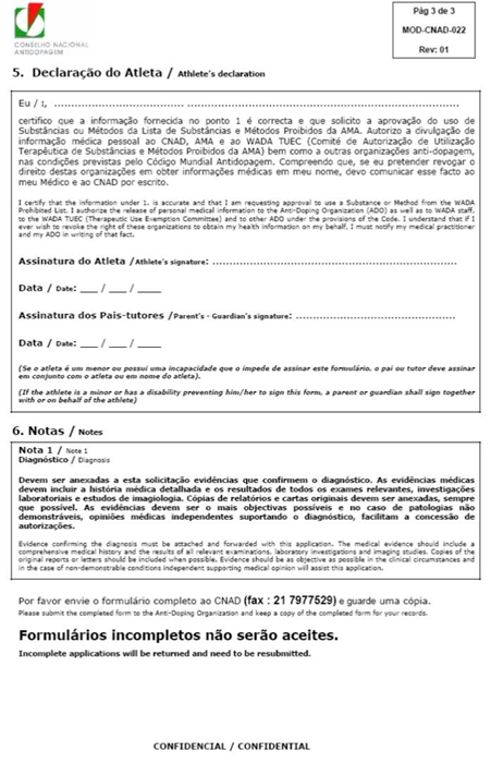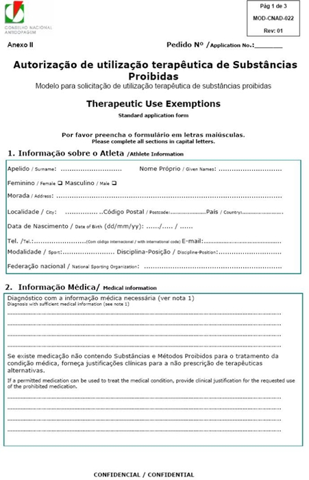 A imagem anterior mostra o efeito dos beta-bloqueantes no organismo. Hormonas Peptídicas As hormonas peptídicas têm diversas funções. Uma as principais é a fixação peptídica, ou seja, ajudam os músculos nas suas funções anabólicas, contribuindo assim na fixação da aminoácidos necessários para a construção destes. Existem vários tipos destas hormonas, tendo cada uma a sua respectiva função: . Eritropoetina – Também conhecida como EPO. Estimula a produção de glóbulos vermelhos, aumentando assim a resistência dos atletas. . hCG – Hormona produzida por um feto durante a gravidez, é também utilizada pelos homens para aumentar a produção de esteróides. Existem também mulheres que engravidam para aumentar a concentração de hormonas femininas que a hCG provoca. Depois do teste de controlo, estas atletas abortam. . HC – Hormona do crescimento, que tal como o nome indica é produzida em grandes quantidades durante a puberdade e permite o crescimento dos indivíduos e a recuperação dos tecidos musculares. . LH – Hormona que existe naturalmente no nosso organismo e que é utilizada para estimular a produção de testoesterona no testículos. A utilização destas drogas pode provocar, entre outras coisas deformações ósseas, miopia, distúrbios hormonais, coágulos sanguíneos, diabetes, hipertensão e doenças articulares. Diuréticos Também apelidados de substâncias mascarantes, estas têm como tarefa aumentar a quantidade de urina produzida, o que leva a alterações no seu controlo, visto que a maior parte das substâncias são ilegais quando encontrada em grandes quantidades. Os diuréticos são também usados para a perda de peso em desportos divididos por categorias de peso. Os mais populares entre os desportistas são o triantereno e a furosemida. Como efeitos secundários podem causar desidratação, doenças renais, perda de sais minerais, cãibras, alteração do volume do sangue e no ritmo cardíaco. Se algum destes se tornar muito grave, pode provocar a morte do indivíduo. Beta-Agonistas Este é o último grande grupo de drogas dopantes. Os beta-agonistas são drogas que se destinam a aumentar a massa muscular e diminuir a massa gorda. Uma droga beta-agonista muito conhecida é a adrenalina, que existe espontaneamente no nosso organismo e que é libertada quando estamos sujeitos a situações de grande tensão (é por isso que, quando ameaçados ou em perigo, o homem consegue faz certas proezas ou utilizar certa força que normalmente não conseguiria usar) Como efeitos secundários prejudiciais temos o aparecimento de insónias, agressividade, tremores e náuseas, falta de concentração, distúrbios psíquicos, aumento da pressão arterial, problemas cardiovasculares... Outras drogas Outras substâncias igualmente proibidas nas competições internacionais são ainda o álcool, todo o tipo de narcóticos estupefacientes e ainda drogas anti-estrogénicas, ou seja, drogas que se destinam a inibir a produção destas hormonas. Este tipo de drogas é proibido pois está geralmente associado ao consumo de esteróides anabolizantes (são utilizadas devido ao efeito aromatizante dos esteróides). Por fim, e a apesar de não serem propriamente consideradas substâncias dopantes, existem também técnicas e métodos proibidos no desporto. São eles: . Aumento do transporte de oxigénio: esta técnica consiste no uso de substâncias (como o EPO) para aumentarem o número de glóbulos vermelhos ou a transfusão de sangue previamente retirado e enriquecido com glóbulos vermelhos. Este método é perigoso pois maior número de glóbulos vermelhos significa sangue mais viscoso, e como tal há um maior risco de ataque cardíaco. . Manipulação química e física: conjunto de técnicas que visa alterar a validade e a integridade das amostras de urina e sangue usadas nos controlos antidoping. Entre elas destacamos a alteração das amostras de urina, a inibição da excreção renal e o uso de substâncias mascarantes. . Doping genético: a dopagem genética é definida como o uso não terapêutico de genes, elementos genéticos ou células que tenham a capacidade de aumentar o rendimento desportivo. Este tipo de doping está ainda em desenvolvimento e ainda não é muito viável, mas poderá ser uma realidade num futuro bem próximo. Esse tipo de doping é usado com recurso a vírus ou bactérias que alteram certos genes em certos músculo do organismo, tornando-o mais adaptado à actividade que pratica. 3. Substâncias Terapêuticas Abaixo estão citadas algumas substâncias terapêuticas, proibidas e permitidas no tratamento de algumas patologias que o atleta pode sofrer. As substâncias mencionadas são apenas alguns exemplos das que podem ser utilizadas actualmente. CATARRO, TOSSE E FARINGITE PROIBIDAS: Medicamentos que contenham Codeína, Efedrina, Propanolamina (Bisolvon compositum)PERMITIDAS: Bromexina (Bisolvon), Dextrometarfano, Doperastina, Zipeprol, Inalações de Mentol, Aerosóis Nasais (Brometo de Ipatrópio e Oximetazolina) e Antibióticos.DIARREIA PROIBIDAS: Morfina e Codeína.PERMITIDAS: Loperamida, Difenoxilato.ASMA E FEBRE DOS FENOS PROIBIDAS: Medicamentos que contenham Efedrina e Pseudoefedrina.PERMITIDAS: Terbutalina, Salbutamol, Corticóides (só em aerosol), Teofilina e Antiestamínicos.DOR DE CABEÇA PROIBIDAS: Medicamentos que contêm Codeína e DestropropoxifenoPERMITIDAS: Aspirina e Paracetamol.DOR MENSTRUAL PERMITIDAS: Ibuprofeno, Buscapina.CONTUSÕES E TRAUMATISMOS PROIBIDAS: Medicamentos que contenham Codeína.PERMITIDAS: Anti-inflamatórios não esteróides.VÓMITOS PERMITIDAS: Primperan.4. Documentos e Autorizações Os documentos abaixo apresentados são dois exemplos de autorizações que os médicos responsáveis têm que preencher para solicitar/justificar a necessidade do atleta tomar medicamentos que contenham substâncias não permitidas pelas leis.
