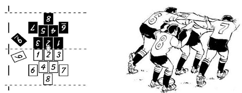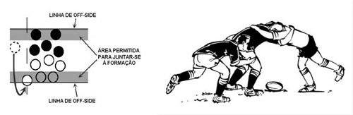 jogadores): no 10) Médio de abertura: Possui grande espírito de organização e comando, e utiliza a sua inteligência para aplicar e mudar as tácticas e estratégias conforme o desenvolvimento do jogo. O abertura está sempre na melhor posição para visualizar as falhas defensivas do adversário e, assim, pode aproveitá-las ao máximo. nos 12 e 13) Primeiro centro e segundo centro: Constituem a parte central da linha dos 3/4. Devem ser óptimos passadores já que a bola tem que passar por eles para chegar aos pontas. nos 11 e 14) Pontas (esquerdo e direito): São os que geralmente marcam os ensaios. São muito rápidos, pois são eles que furam a defesa contrária, e avançam a equipa. nos 15) Arriére ou defesa: É um jogador frio que possui reflexos rápidos. Esta posição requer muita responsabilidade porque por vezes é ele quem tem de placar o adversário para impedir o ensaio. É fora de jogo quando um jogador passa a bola para a frente, a um companheiro da sua equipa e ele toca na bola, como mostra a imagem. Ou quando um jogador chuta a bola e o seu companheiro no momento em que ele está a chutar está à sua frente, e toca na bola. (No râguebi apenas é permitido passar com a mão para trás mas com o pé é permitido passar para a frente e para trás). O ruck pode ocorrer apenas no decorrer do jogo. Para formar um ruck os jogadores devem estar ligados com pelo menos um braço em redor do corpo do adversário e a bola deve permanecer no chão. Regras do ruck: . Os jogadores não devem tocar na bola com a mão; . Um jogador não deve cair sobre a bola, pois assim está a impedi-la de sair do ruck; . Os jogadores não podem entrar no ruck de lado ou pelas costas da equipa adversária, se o fizerem estão fora-de-jogo (off-side); . Um jogador pode tirar a bola do ruck quando ela está atrás do ultimo pé do jogador de uma equipa na formação.
