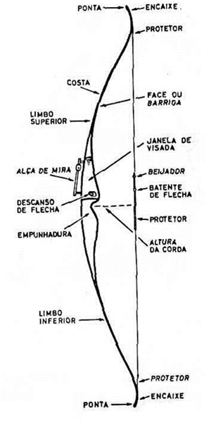 Arco encordoado (corda em repouso) e arco armado (corda para tiro), respectivamente.