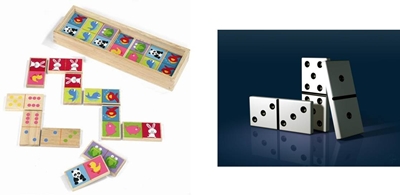 Dominó: O Dominó é um jogo que nos obriga a pensar e a raciocinar, trabalhando a lógico-matemática. É um jogo composto por peças rectangulares com vários símbolos, (bolinhas, números, animais, peças de fruta, etc.); o Dominó joga-se combinando os números de forma a ficarem idênticos. Exs.: