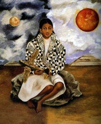 Autor: Frida Kahlo Título da Obra: Retrato de Lucha Maria, uma Rapariga de Tehuacan Data: 1942 Técnica: Óleo Formato: 54,6 x 43,2 cm Suporte: Masonite Assunto Tratado: Nesta pintura, Frida Kahlo mostra uma rapariga indígena que parece estar perdida num deserto. O fundo divide-se entre a Noite e o Dia… Um tema comum que utilizou em outras pinturas. À direita está o Sol e por baixo a Pirâmida do Sol em Teotihuacán; enquanto que à esquerda encontra-se a Lua e a Pirâmide da Lua do mesmo lugar. A rapariga tem um xaile em redor dos seus ombros, dando a impressão de que o Sol está frio. A sua mão sustém um modelo de um avião militar camuflado, que bem poderia ser um símbolo da II Guerra Mundial. Corrente Artística: Arte Fantástico Outros Trabalhos Relacionados