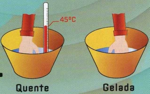 Material: 1 - Uma tina com água quente (45ºC) 2 - Uma tina com água fria (10ºC) 3 - Outra tina com água normal 4 - Dois termómetros. Natureza: ___ ; Alcance: ____ 5 - Placa de aquecimento