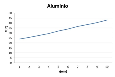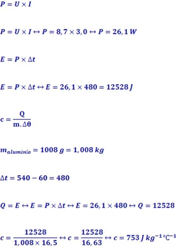 Procedimento experimental: . Montou-se um circuito elétrico com uma fonte de alimentação, um voltímetro em paralelo co a resistência de aquecimento, um amperímetro ligado em série e um interroptor. . Introduziu se no bloco calométrico de aquecimento de alumínio a resistência de aquecimento e fechou-se o interruptor. . Fez-se as leituras da temperatura em relacção ao tempo, de minuto a minuto (durante 10 minutos). . Registou-se no caderno os valores da intencidade da corrente e da diferença de potêncial. . Efectuou-se os cálculos e determinou-se a capacidade témica massica do aluminío. Resultados: Tabela: