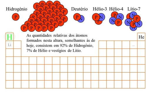 A Nucleossíntese Primordial Pelo centésimo segundo, já um universo semelhante ao nosso estava formado, contudo, consistia ainda em nucleões isolados. Foi apenas aos 108K que a energia ambiente desceu o suficiente para que os neutrões e protões pudessem dar origem a núcleos ao se associarem de várias formas. Há que salientar, no entanto, que o número de protões, sendo várias vezes maior do que o de neutrões, fez com que muitos protões se mantivessem isolados para mais tarde darem origem ao hidrogénio, bastante abundante. Para além disso, os núcleos de deutério, hélio-3, hélio-4 e lítio-7 são formados nesta fase.