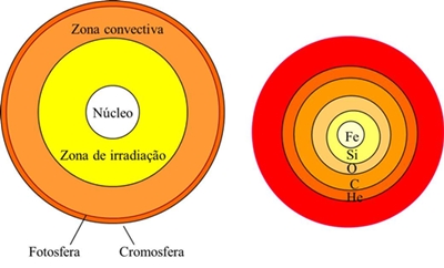 A Estrutura A maioria das estrelas têm uma estrutura similar, por camadas: O núcleo, a zona central da estrela, onde a temperatura ultrapassa os 10 milhões de graus Celsius e a pressão atinge, pelo menos, o milhão de atmosferas é onde se dão as reacções de fusão nuclear. Pode ter várias camadas no caso das estrelas com mais massa, onde a fusão nuclear decorre usando núcleos diferentes e progressivamente mais pesados à medida que nos aproximamos do centro. A zona de irradiação é aquela que recebe a radiação gama provinda do núcleo, retardando o seu avanço devido à sua elevada densidade e absorvendo grande parte da sua energia, que re-imite na forma de calor. A zona convectiva é aquela na qual que os gases já têm mobilidade, levando o calor à superfície através de correntes de convecção. A fotosfera é a camada superficial de uma estrela através da qual esta emite a maior parte da sua radiação. A cromosfera, é a zona onde a cor da estrela se define através da emissão de radiação por parte do hidrogénio depois de ionizado.