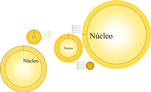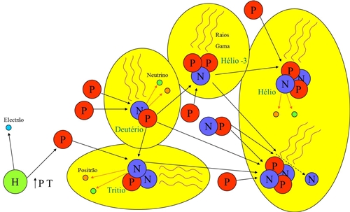 Devido às condições de temperatura e pressão a que o Hidrogénio no núcleo de uma estrela é sujeito, as características de gás tornam-se irrelevantes, passando este a comportar-se como um metal. Assim, sujeito à pressão e temperatura, os átomos são ionizados, mantendo-se um suplemento contínuo de protões para as reacções nucleares. Os protões são pressionados e dá-se a fusão nuclear. Contudo, visto ambos que têm cargas positivas, os protões repelem-se, mas a força electromagnética é vencida e um dos protões liberta um positrão, tornando-se num neutrão. Formam-se núcleos mais pesados, mas que têm uma massa inferior à da soma dos núcleos que lhe deram origem, transformando-se esta massa em raios gama de energia suficiente para mais que compensar a energia gasta a estabelecer as ligações (Dmc2). Este processo é feito por etapas nas quais podem intervir apenas protões ou núcleos previamente formados. Podem haver também fusões nucleares que criem Hélio com excesso de neutrões, mas este é instável e os neutrões em excesso são prontamente libertados. As Reacções