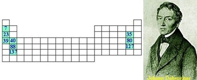 Fig. 2 – Berzelius num retrato pintado por Olof Johan Johann Döbereiner Johann Wolfgang Dobereiner, nasceu em Dezembro de 1780 e faleceu em Março de 1849, foi professor de química na Universidade de Lena. . Organizou as “tríades” (Fig. 3), grupo de 3 elementos com propriedades físicas semelhantes; . Iniciou a noção de grupo; . Contribuiu para o desenvolvimento da tecnologia dos vidros ópticos. Johann começou a estudar a lista dos elementos conhecidos, registando as suas propriedades e pesos atómicos, e acabou por descobrir dois grupos de elementos com o mesmo padrão.