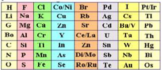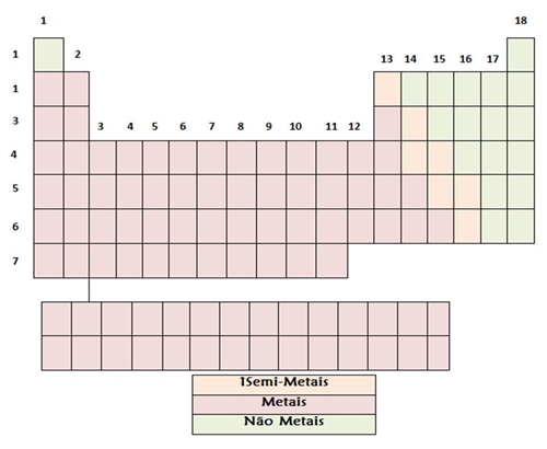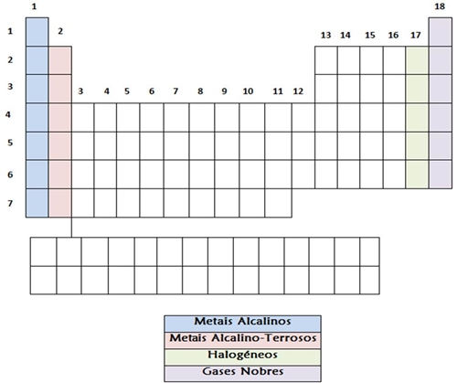 Fig. 14 – Tabela Periódica as diferentes famílias Na tabela seguinte (Fig. 15), apresentam-se, de forma resumida, as propriedades que se destacam das famílias dos elementos acima apresentados.