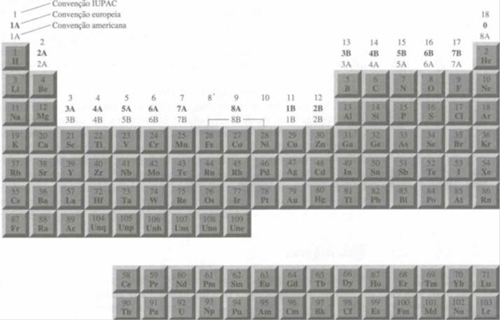 Fig. 12 – Tabela Periódica com diferentes convenções A tabela periódica actual A Tabela Periódica (Fig. 13) é, efectivamente, um instrumento organizador de conhecimentos sobre os elementos químicos, onde estes estão ordenados por ordem crescente de número atómico (Z). É constituída por 116 elementos distribuídos em 7 linhas horizontais – períodos (azul), e 18 colunas verticais – grupos ou famílias (laranja).
