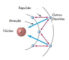 Fig. 19 – Tabela Periódica com os Blocos s, p, d, e f Propriedades periódicas dos elementos A variação periódica de algumas propriedades dos elementos – propriedades periódicas, depende das configurações electrónicas e, como tal, da posição dos elementos na Tabela Periódica. Os dois factores base que originam a variação dessas propriedades são: . o aumento do número quântico principal (n) das orbitais de valência ao longo de um grupo – factor que provoca o afastamento dos electrões de valência para níveis de energia sucessivamente mais afastados do núcleo (níveis de energia mais energéticos), o que favorece uma menor acção atractiva por parte dos protões que estão no núcleo; . aumento do número atómico (Z) ao longo de um período – factor que tem como consequência directa um aumento da carga nuclear, o que faz com que os electrões sejam mais fortemente atraídos pelo núcleo; contudo, os electrões não são atraídos pela carga nuclear total, mas sim pela carga nuclear efectiva – carga do núcleo enfraquecida pelas repulsões electrão-electrão. O conceito da carga nuclear efectiva permite ter em conta a influência da blindagem (Fig. 20) nas propriedades periódicas. A blindagem pode ser entendida como a protecção que os electrões das orbitais internas (electrões de blindagem) exercem sobre os electrões externos (electrões de valência), pois eles diminuem a atracção que o núcleo, naturalmente, exerce sobre os mesmos. Como é lógico, em átomos polielectrónicos as repulsões existentes entre os electrões também contribuem para a atenuação da força de atracção núcleo - electrões de valência.