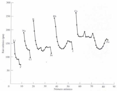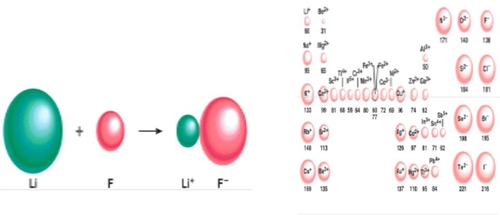Fig. 22 -Variação do raio atómico com o número atómico Ao observar o gráfico, pode-se concluir que, de uma forma geral, os átomos de menores dimensões constituem os elementos do grupo dos halogéneos e os de maiores dimensões são os metais alcalinos. É de destacar que nos lantanídeos, a diminuição do raio atómico é muito acentuada, pois enquanto a carga nuclear aumenta, os electrões vão sendo adicionados às orbitais 4f, pelo que são atraídos de forma cada vez mais significativa. Raio Iónico (Fig. 23) Como é de esperar, quando um átomo se transforma num ião (partícula com carga eléctrica) o seu tamanho sofre alterações. Os átomos têm tendência a transformar-se em iões para adquirem um mínimo de energia, ou seja, um máximo de estabilidade. Isto é conseguido quando a configuração electrónica do ião é igual à do gás nobre que lhe é mais próximo na Tabela Periódica. Se o átomo tem tendência a perder electrões origina um catião e o seu tamanho diminui, porque como a carga nuclear permanece igual e a remoção de um ou mais electrões reduz as repulsões electrão-electrão, a nuvem electrónica contrai-se. Se o átomo tem tendência a receber electrões origina um anião e o seu tamanho aumenta, porque os electrões adicionais favorecem a expansão da nuvem electrónica. O raio iónico nem sempre tem o mesmo valor, depende da estrutura cristalina em que o ião está inserido e da natureza e disposição dos iões vizinhos. O catião é sempre mais pequeno do que o átomo a partir do qual se formou.