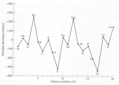 Fig. 27 – Variação da energia de ionização com o número atómico Nos elementos de transição, o aumento da energia de ionização ao longo de um período é apenas ligeiro, porque mesmo com o aumento da carga nuclear, o efeito de blindagem que os electrões internos 3d exercem sobre os 4s é maior do que o efeito de blindagem que existe entre os electrões da camada de valência (os electrões que são removidos em primeiro lugar são os da orbital 4s), fazendo com que a carga nuclear efectiva aumente muito lentamente entre elementos de transição consecutivos. Conjugando as duas propriedades já referidas conclui-se que variam numa forma inversa: quanto maior o raio atómico de um dado átomo menor é a energia de ionização do respectivo elemento químico e vice-versa. Esta relação faz todo o sentido, pois se o electrão está mais distante do núcleo é mais fácil arrancá-lo ao átomo. Afinidade Electrónica A afinidade electrónica depreende-se como a variação de energia que ocorre quando um electrão é captado por um átomo, no estado gasoso, para formar um ião mononegativo. Por convenção, atribui-se um valor negativo à afinidade electrónica quando há libertação de energia (se há libertação energia o anião é mais estável do que o átomo neutro). Quanto mais negativa for a afinidade electrónica, maior a tendência do átomo para receber um electrão. Em geral, ao longo da Tabela Periódica a afinidade electrónica (fig. 28): - diminui ao longo do grupo, embora de modo ligeiro; como aumenta o tamanho do átomo, os electrões estão mais distantes do núcleo e, como tal, são menos atraídos, pelo que o núcleo tem muita dificuldade em captar mais um electrão; - aumenta ao longo do período, porque o facto dos átomos terem cada vez maior carga nuclear significa que lhes é mais fácil atrair o electrão, à excepção dos gases nobres.