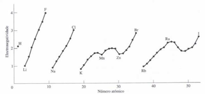 Fig. 28 – Variação da afinidade electrónica com o número atómico para os primeiros 20 elementos Ao observar o gráfico, verifica-se que: . as afinidades electrónicas dos metais são, geralmente, menores (mais positivas) do que as dos não-metais; . os halogéneos são os que têm maiores afinidades electrónicas (facilmente captam um electrão para adquirem a configuração electrónica do gás nobre) . os gases nobres não têm tendência a captar electrões (têm afinidades electrónica positiva), por terem todas as suas orbitais completamente preenchidas; . os metais alcalino-terrosos também não têm tendência para captar electrões. Como se previa, a afinidade electrónica varia na mesma razão da energia de ionização (se é mais difícil arrancar um electrão a um átomo, é porque ele facilmente capta electrões) e na razão inversa do raio atómico. Electronegatividade A Electronegatividade mede a tendência de um átomo para atrair os electrões quando está ligado quimicamente a outro átomo. Esta grandeza não pode ser medida directamente, mas compreende-se que está relacionada com a afinidade electrónica e com a energia de ionização do elemento em questão: um átomo com uma elevada afinidade electrónica e energia de ionização, possui uma Electronegatividade alta e vice-versa. A Electronegatividade: . diminui ao longo de um grupo, pois aumenta a facilidade com que os átomos cedem electrões; . aumenta ao longo de um período, porque diminui a tendência dos átomos para perderem electrões. Não esquecer que os metais de transição não seguem estas tendências (fig. 29).