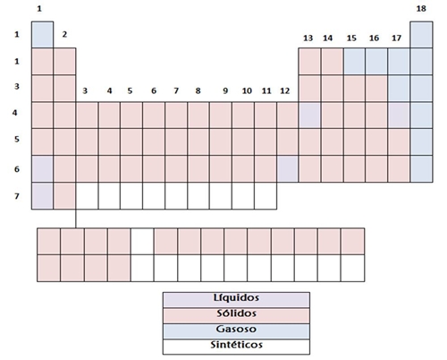 Fig. 17 - Tabela Periódica com os metais, semi-metais e não metais Estados Físicos (Fig. 18) A maior parte das substancias elementares encontram-se no estado sólido, excepto o Mercúrio (Hg) , Césio (Cs), Frâncio (Fr), Bromo (Br) e Gálio (Ga) que se encontram no estado Liquido e Hidrogénio (H), Azoto (N), Oxigénio (O), Flúor (F), Cloro (Cl) e os elementos do 18 grupo que se encontram no estado Gasoso.