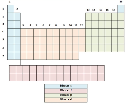 Fig. 18 -Tabela Periódica com os estados físicos Elementos representativos, de transição e os seus blocos A localização dos elementos na Tabela Periódica, está relacionado com a sua configuração electrónica. A Tabela Periódica pode ser dividida em blocos (Fig. 19) (bloco s, p, d e f), conforme o tipo de orbitais em que se encontram os electrões de valência. Os elementos representativos do grupo 1 e 2 constituem o bloco s. O bloco p integra as restantes famílias dos elementos representativos. Pode dizer-se que os elementos representativos são aqueles que têm as orbitais s ou p de maior número quântico principal incompletamente preenchidas. Quanto ao grupo 18, os elementos pertencem todos ao bloco p, à excepção do hélio, que tem configuração electrónica 1s2. Os elementos de transição correspondem ao bloco d. Por último, os elementos de transição interna, isto é, as séries dos lantanídeos (6º período) e dos actinídeos (7º período) representam o bloco f. É de notar que os elementos do bloco f são muito difíceis de distinguir, pois, por terem as orbitais f não completamente preenchidas, têm todos propriedades muito similares.
