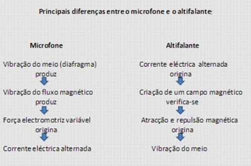 | O funcionamento do microfone e do altifalante tem por base a indução electromagnética. Ambos são constituídos por uma membrana ou diafragma, uma bobina e um íman, contudo, no microfone um sinal sonoro é convertido num eléctrico enquanto no altifalante o processo é inverso, um sinal eléctrico é convertido em sinal sonoro. Funcionamento do microfone: Quando o som atinge a membrana, esta entra em oscilação devido ás variações de pressão, provocadas pela onda sonora, onde de pressão. Como a membrana está ligada à bobina, esta passa a oscilar com a mesma frequência. Durante este movimento, o fluxo magnético do campo criado pelo íman varia, induzindo uma força electromotriz que dá origem a uma corrente eléctrica na bobina do microfone. Esta corrente alternada induzida na bobina apresenta as mesmas características do som original, quer em frequência quer em intensidade. Funcionamento do altifalante: Quando a corrente eléctrica passa na bobina, varia de acordo com os sinais eléctricos recebidos (resultantes, por exemplo, da conversão no microfone de um sinal sonoro), dando origem a um campo magnético variável que, ao interagir com o campo magnético criado pelo íman, provoca na bobina um movimento oscilatório. Uma vez que a bobina está ligada a uma membrana, esta passa a vibrar com a mesma frequência e com a mesma intensidade, reproduzindo o som original, ou seja, a membrana oscilante não é mais do que uma fonte sonora.  __________________________________ Outros Trabalhos Relacionados | Ainda não existem outros trabalhos relacionados | | |