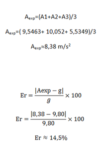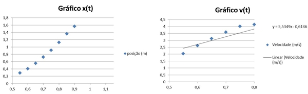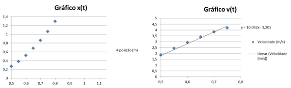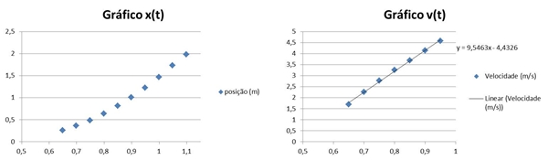 | Resultados: Tempo (s) | Posição (m) | Velocidade (m/s) | 0,6 | 0,184243 | 0,993412778 | 0,65 | 0,26069 | 1,693685556 | 0,7 | 0,361634 | 2,265828333 | 0,75 | 0,489326 | 2,778913889 | 0,8 | 0,640278 | 3,256500556 | 0,85 | 0,816551 | 3,703477222 | 0,9 | 1,010909 | 4,144948889 | 0,95 | 1,229541 | 4,587686111 | 1 | 1,471569 | 4,712895 | 1,05 | 1,739451 | 3,838078333 | 1,1 | 1,983473 | 0,656141667 |  Tempo (s) | Posição (m) | Velocidade (m/s) | 0,45 | 0,188691 | 1,12400611111 | 0,5 | 0,27359 | 1,86372611111 | 0,55 | 0,384843 | 2,43710888889 | 0,6 | 0,519357 | 2,943535 | 0,65 | 0,680911 | 3,40003944444 | 0,7 | 0,860777 | 3,83541722222 | 0,75 | 1,060881 | 4,17953166667 | 0,8 | 1,292767 | 3,98270333333 | 0,45 | 0,188691 | 1,12400611111 | 0,5 | 0,27359 | 1,86372611111 | 0,55 | 0,384843 | 2,43710888889 |  Tempo (s) | Posição (m) | Velocidade (m/s) | 0,55 | 0,287768 | 2,036785 | 0,6 | 0,406808 | 2,61563388889 | 0,65 | 0,551146 | 3,12697388889 | 0,7 | 0,721176 | 3,58588 | 0,75 | 0,910239 | 4,00395388889 | 0,8 | 1,122936 | 4,13568611111 | 0,85 | 1,362131 | 3,31405055556 | 0,9 | 1,56513 | 0,498317777778 | 0,55 | 0,287768 | 2,036785 | 0,6 | 0,406808 | 2,61563388889 | 0,65 | 0,551146 | 3,12697388889 |  Cálculos:  Conclusão: A queda livre é o movimento de um corpo que tem velocidade inicial 0 e, desprezando o atrito (resistência do ar), apenas depende da força gravítica do nosso planeta. A um corpo em queda livre chama-se grave. Galileu foi o primeiro físico a concluir que, desprezando a força de atrito do ar, independentemente da massa, dois corpos largados simultaneamente adquirem a mesma aceleração gravítica, isto é, dois corpos largados de uma mesma altitude e ao mesmo tempo, caem na superfície ao mesmo tempo pois a única força que influenciará o tempo em queda é a Força Gravítica. As principais caraterísticas de Fg são a sua direção vertical, o sentido descendente (de cima para baixo) e o valor que é, aproximadamente 10 m/s2 sendo que este valor depende da latitude e altitude do planeta. A partir da Lei da Gravitação Universal, formulada por Newton, podemos inferir que o valor da aceleração gravítica é uma força que atrai todos os corpos no Universo. Em todos os ensaios conseguimos obter gráficos velocidade-tempo com o movimento pretendido – movimento uniformemente acelerado. O erro relativo é cerca de 15 % que podem ser explicados pelo facto de termos desprezamos o valor da força de atrito quando ela não era completamente zero. __________________________________ Outros Trabalhos Relacionados | Ainda não existem outros trabalhos relacionados | | |