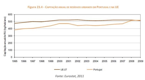 Gráfico 1 – Produção/capitação de RSU em Portugal Entre 1995-2008 a capitação anual de RU (resíduos urbanos per capita) em Portugal foi sempre inferior à média da EU-27, tendo esta tendência sofrido alterações em 2009, quando o valor português de resíduos urbanos per capita (511 kg/hab./ano) se assemelhou ao valor da média da EU-27 (512 kg/hab./ano).