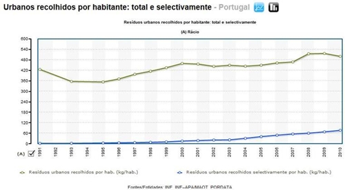 Gráfico 3 – Recolha de RU por habitante total e seletivamente em Portugal 1. Recolha Diferenciada (separativa ou seletiva) – Processo de recolha de resíduos que podem ser reciclados, previamente separados na fonte. E que são posteriormente encaminhados para as estações de triagem e depois para as indústrias recicladoras.