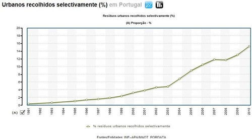 Gráfico 4 – Recolha de RU seletivamente em Portugal a) Porta-a-porta – consiste na colocação dos resíduos em sacos de forma a serem posteriormente recolhidos pelas câmaras municipais responsáveis. Esta recolha varia consoante a morfologia urbana e as características funcionais de cada área da cidade.