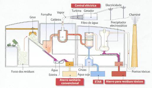 Figura 12 – Centrais de incineração Vantagens deste processo: . Redução dos volumes a depositar em aterros (pode chegar a 90%); . Eliminação de resíduos patogénicos e tóxicos; . Produção de energia elétrica. Desvantagens deste processo: . Elevados custos financeiros (investimento e manutenção); . Elevados custos ambientais (poluição atmosférica).
