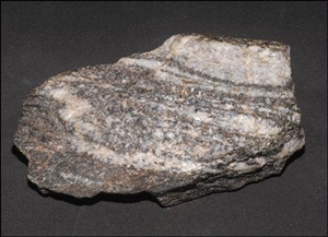 Rochas Metamórficas Gnaisse - Rocha metamórfica, formada por camadas escuras de minerais ferromagnesianos, como micas, e camadas claras de cor branca, cinzenta ou rosa, constituídas por quartzoe feldspatos. (textura foliada)