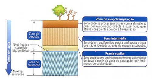 Fig. 4 – Zonas de humidade num aquífero livre. 3.2. Aquífero confinado ou cativo Formação geológica onde a água se acumula e movimenta, estando limitada no topo e na base por materiais geológicos impermeáveis. Neste tipo de aquíferos a pressão da água é superior à pressão atmosférica. A recarga dos aquíferos cativos, ao contrário do que acontece nos aquíferos livres, é feita lateralmente.