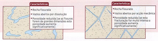 Tabela I – Tipos de captação de águas subterrâneas. 4. PARÂMETROS CARACTERÍSTICOS DOS AQUÍFEROS A capacidade de um aquífero para armazenar água e a possibilidade da sua extracção de forma eficaz relacionam-se com características que as formações geológicas apresentam. 4.1. Porosidade Esta característica resulta do facto de nas rochas existirem espaços vazios que não estão preenchidos por matéria sólida (poros) mas, normalmente, por água ou ar. Dependendo da forma que os poros apresentam, as formações rochosas podem ser divididas em: Rochas porosas