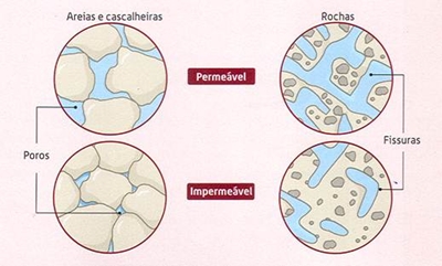 Fig. 8 – Relação entre porosidade e permeabilidade. 5. COMPOSIÇÃO QUÍMICA DAS ÁGUAS SUBTERRÂNEAS As águas subterrâneas apresentam características muito próprias e que se relacionam com o contexto geológico da região onde são captadas. Estas águas nunca são puras, mas soluções, em regra, muito diluídas, de numerosas substâncias. É possível estabelecer uma relação entre a litologia inerente a essas formações e a composição química da água.