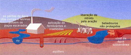 Fig. 9 – Tipos de actividades agrícolas que intervêm na poluição de aquíferos. 6. 2. Poluição de origem urbana O aumento populacional tem causado enormes problemas, em particular na gestão dos resíduos que são produzidos pelo Homem, vulgarmente chamados “lixos”. Os resíduos, mesmo quando depositados em aterros sanitários, com o decurso do tempo vão evoluindo registando diversas transformações, que originam muitas vezes materiais perigosos para os aquíferos. Destes materiais, os mais nocivos são as chamadas águas lixiviantes que, caso não sejam convenientemente tratadas, ou caso ocorra uma fuga destas águas, poderão contaminar, de forma muitas vezes irreversível, os aquíferos.