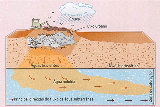 Fig. 10 – Poluição de um aquífero devido à sua contaminação por águas lixiviantes. 6. 3. Poluição de origem industrial A actividade industrial, nomeadamente as indústrias petroquímicas, metalúrgica e alimentar, produz resíduos líquidos que são lançados, muitas vezes, nos solos ou nas linhas de água, sem qualquer tipo de tratamento. As substâncias poluidoras (metais pesados, produtos orgânicos e outras) geradas por estas actividades são, em alguns pontos do nosso país, as grandes responsáveis pelo estado de degradação em que se encontram alguns aquíferos.