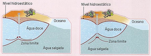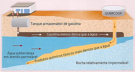 Fig. 11 – Poluição provocada pela actividade industrial: fuga de combustível e de produtos tóxicos para o aquífero. 6. 4. Sobreexploração de aquíferos costeiros Para além dos tipos de poluição já referidos, a sobreexploração de um aquífero pode, também, provocar a sua poluição. Retirar água em excesso de um aquífero pode originar alterações químicas ou bacteriológicas nas águas remanescentes, tornando-as impróprias para o consumo. Os casos de sobreexploração mais típicos são os que ocorrem nas zonas costeiras. Assim, se determinado aquífero, localizado no litoral, for explorado em excesso, a diminuição da quantidade de água doce possibilita o avanço da água salgada subterrânea em direcção ao continente, acabando por atingir as captações que se localizam mais próximo do mar. Quando esta situação acontece, é muito difícil a recuperação de um aquífero.