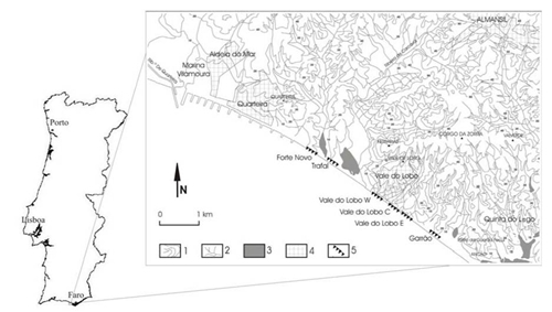 Figura1: Área de estudo Legenda: 1) curvas de nível, 2) rede hidrográfica, 3) lagunas costeiras/áreas de sapal, 4) áreas urbanas, 5) sectores de arriba.