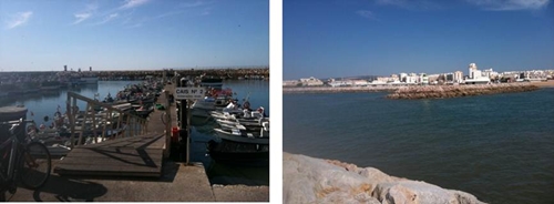 Figura 3: Quebra-mar do porto de pesca de Quarteira. Na primeira imagem vê-se o porto, onde foi realizada a entrevista e ao fundo o quebra-mar. Na segunda imagem vê-se a parte mais lateral desde porto. Como consequência, houve uma maior erosão a oriente das praias de Quarteira, o que criou a necessidade de se construírem mais estruturas de proteção, nomeadamente esporões. Tendo assim aumentado a área afetada por estes esporões.